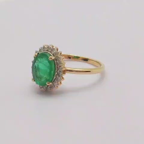 Anillo hecho en oro amarillo 14K con diamantes corte brillante y una esmeralda corte oval.
