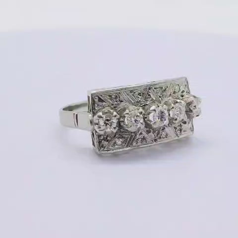 Anillo placa vintage hecho en platino con 5 diamantes corte brillante de 8 puntos cada uno engastados en grifas altas y 8 diamantes pequeños de 1,5 puntos cada uno en los triángulos grabados a mano.